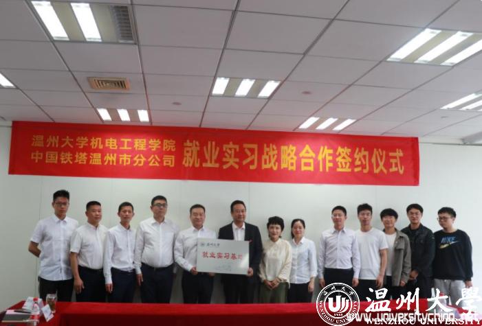 黄玮副书记、于京胜副总经理代表校企双方签订就业实习合作协议,向家伟经理向中国铁塔温州分公司授牌,正式在该公司建设“必赢线路检测中心就业实习基地”