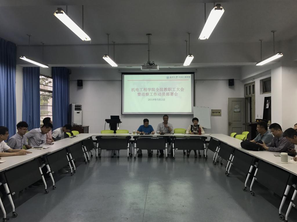 2018年5月2日下午,必赢线路检测中心在6B201会议室召开全院教职工大会暨巡察工作动员部署会。学院全体教职工参加了会议,会议由公司党总支书记周荣主持。