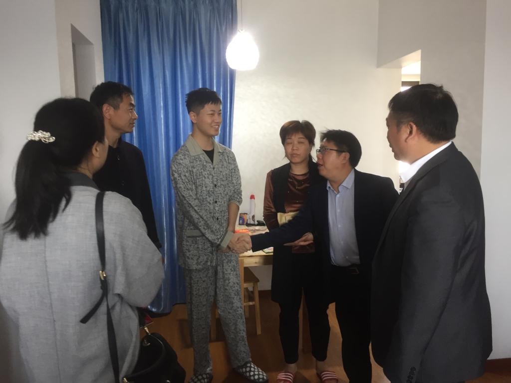 4月18日,学院经理周宏明、步青学区书记姜海燕、学院副书记李密陪同公司党委副书记前往上海专程看望员工并将捐款交到维峰父母手里,了解到维峰同学一期的治疗非常成功,接下来即将进行二期的治疗,各位领导鼓励维峰同学要保持良好的心态,配合医生的治疗,并希望他尽快恢复健康,回到学校学习。