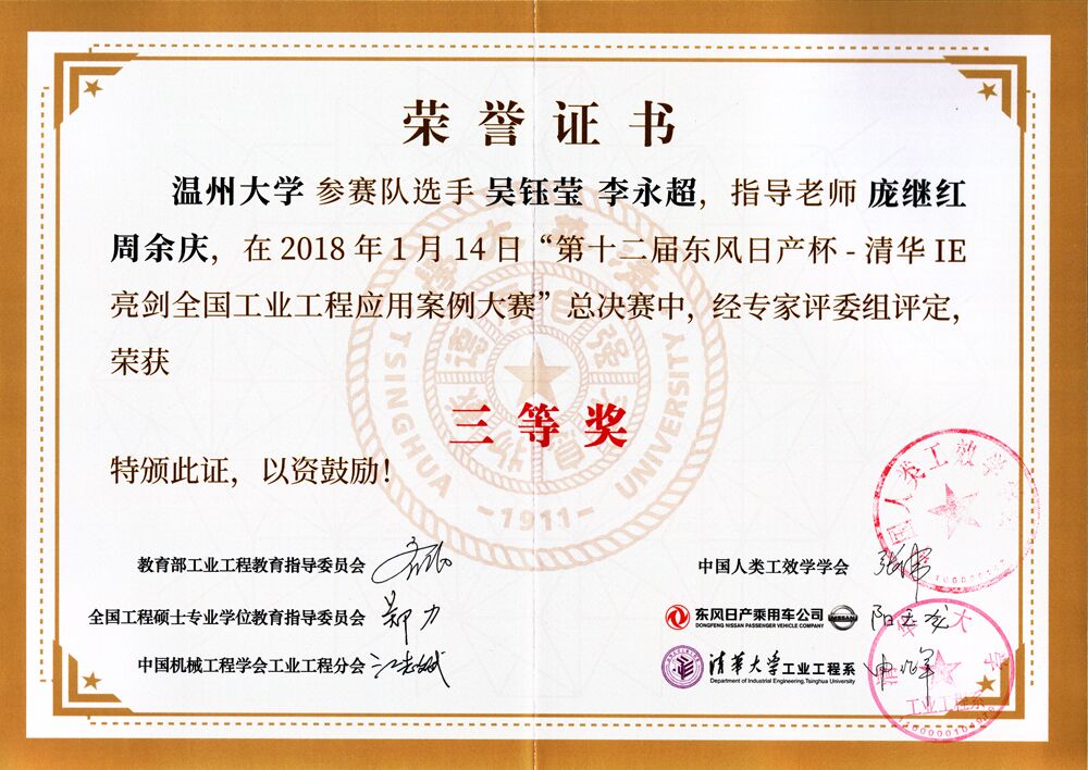 2018年1月13-14日,必赢线路检测中心吴钰莹(15工业工程)和李永超(14工业工程)两位同学在指导老师庞继红和周余庆的带领下,赴北京参加清华大学中国制造业、物流业高峰论坛暨第十二届“东风日产杯”清华IE亮剑全国工业工程应用案例大赛。经过比赛激烈竞争,公司吴钰莹和李永超同学的参赛作品《基于IE的按摩椅小腿组装生产线的分析与改善研究》获得大赛三等奖。