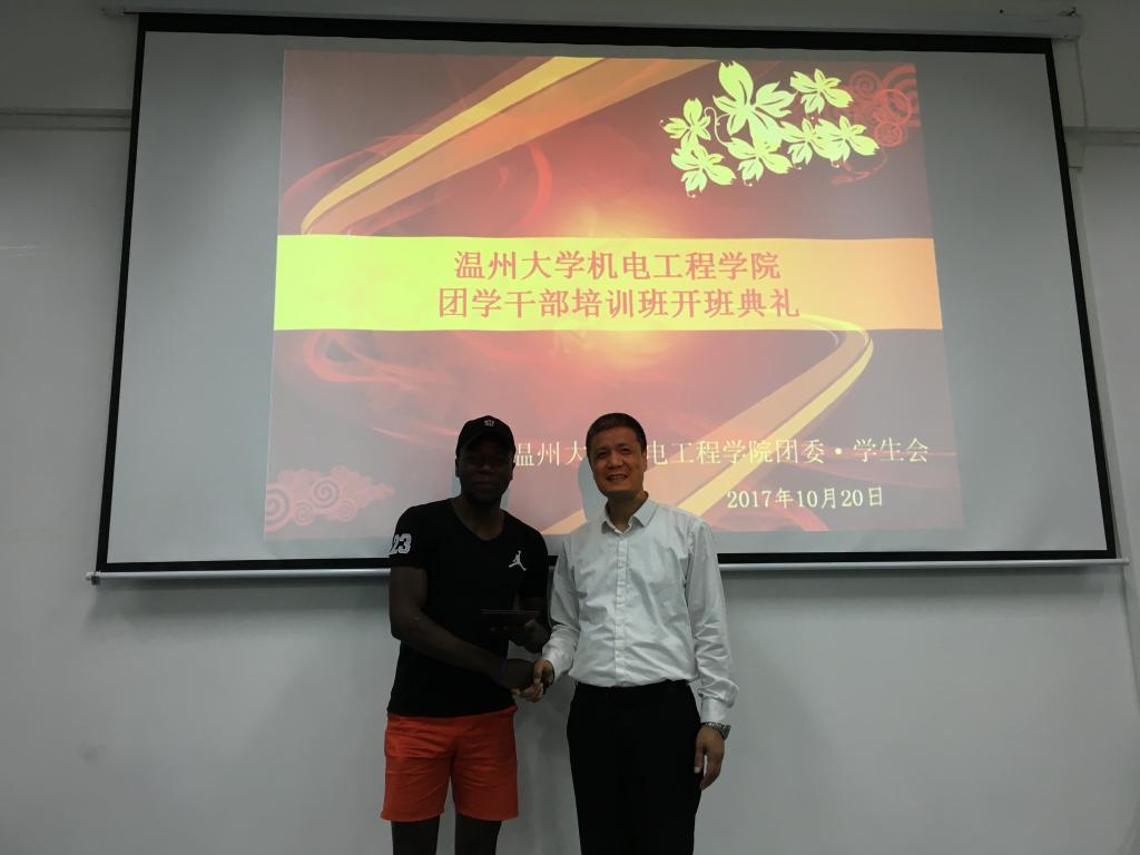 在开班之前,公司党总支书记周荣为来自津巴布韦的文体部名誉部长Alfred颁发了聘书。