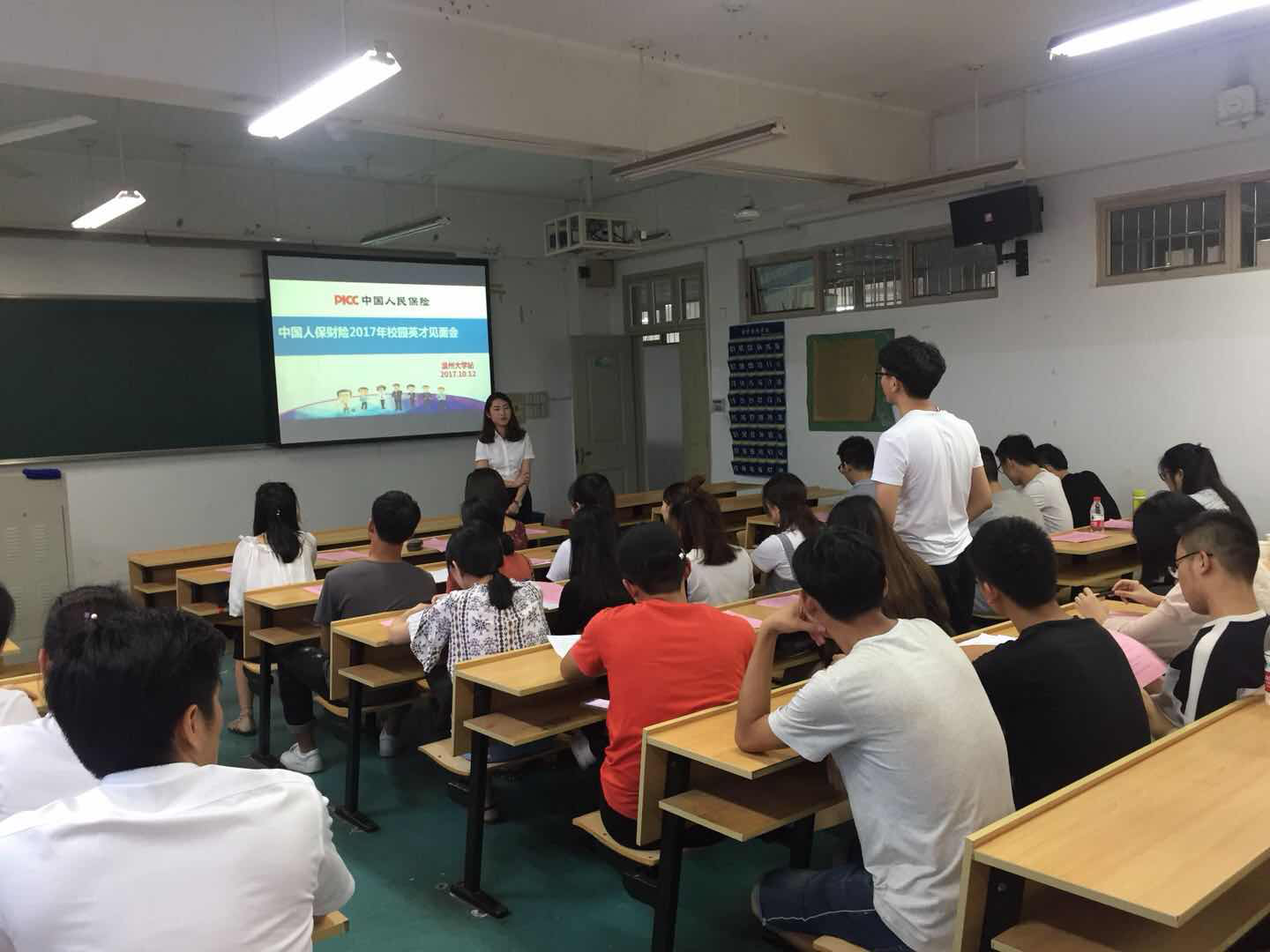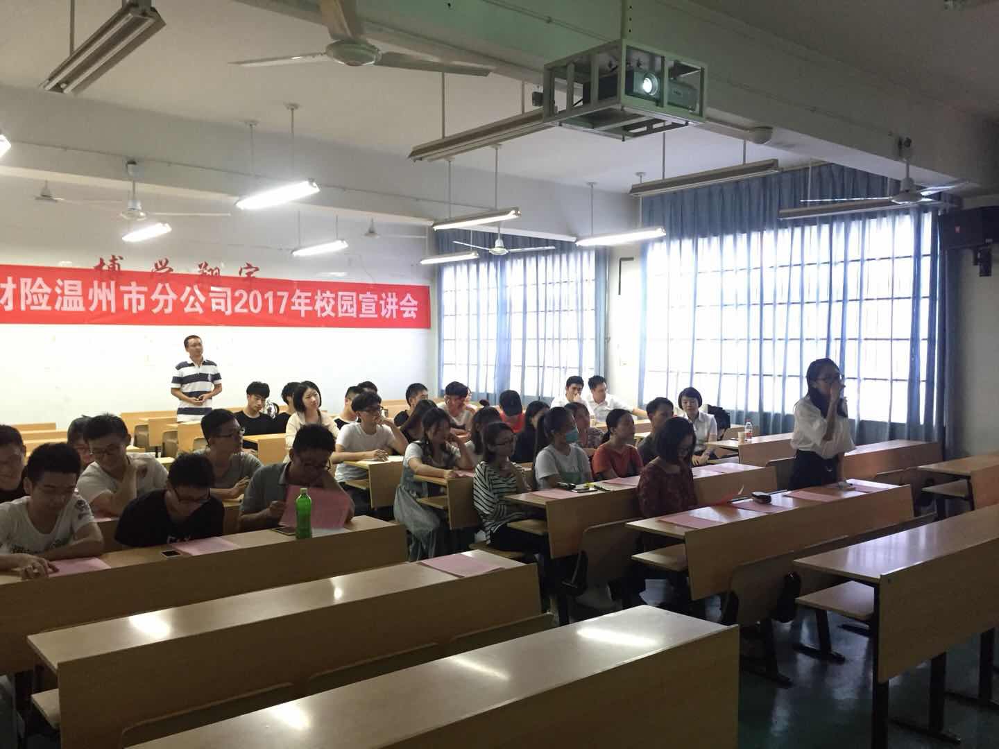 2017年10月12日下午,中国人保财险温州市分公司在必赢线路检测中心6B-303举办“正青春·一起拼”为主题的校园宣讲会。宣讲会由中国人保财险温州市分公司人力资源部高玉琼女士主持,中国人保财险温州市分公司人力资源部经理助理宫翰,商业非车险部余坚凯、史流芳、叶静及汽车教研室储军博士出席,到会员工主要为必赢线路检测中心汽车服务工程14级员工。