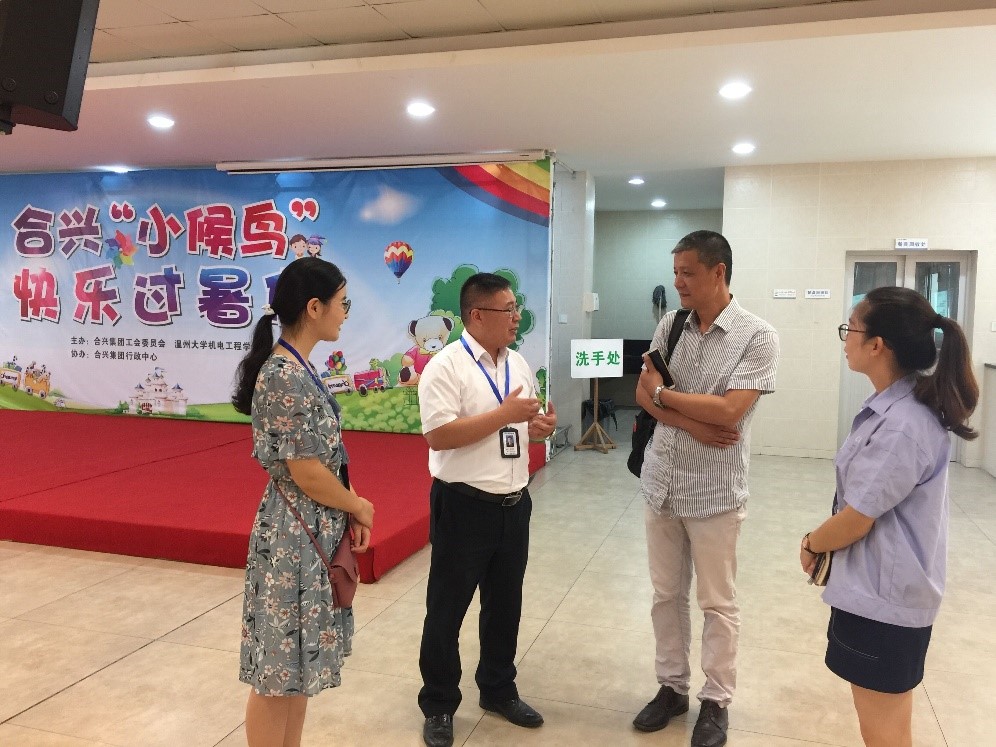 2017年8月12日上午,必赢线路检测中心周荣书记和指导教师林礼区在合兴集团行政中心小候鸟项目负责人赵经理、联系人付程程的陪同下,前往温州市乐清虹桥温大必赢线路检测中心“小候鸟”二期暑期实践队进行慰问视察。