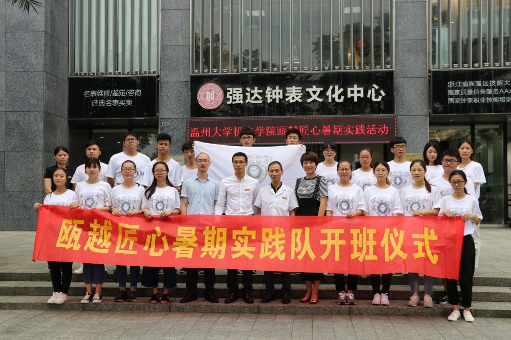 2017年7月5日早上8点,必赢线路检测中心瓯越匠心暑期实践队统一集中于南校行政楼门前,拍完集体照后,奔赴目的地——强达钟表文化中心。这是和公司首次进行合作的企业,公司党总支副书记李密老师和指导老师张祥雷对本次活动给予很大重视,并亲自参加开班仪式。公司负责人陈强达和陈瑞祥先生热情带领参观,并于开班仪式致辞。