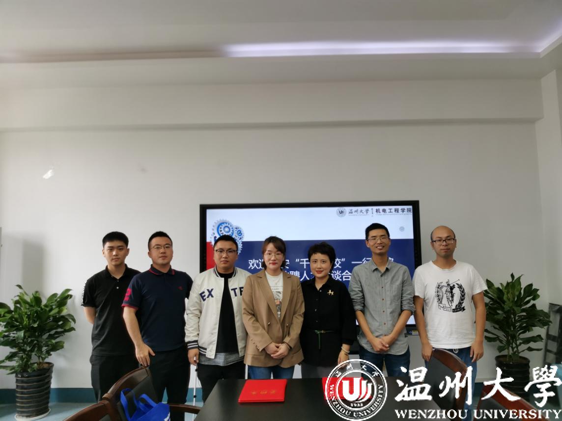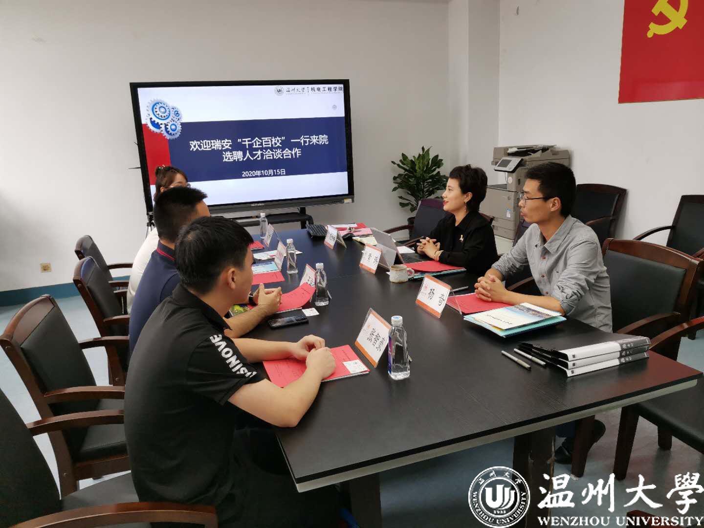2020年10月15日,浙江润泰自动化科技有限公司方顺波总经理、方一帆经理,温州彬济人力资源有限公司王学杰总经理、张智豪助理一行4人来访公司进行校企合作洽谈,公司党委副书记黄玮、学工办负责人杨奇、辅导员颜孙艇参加洽谈会。