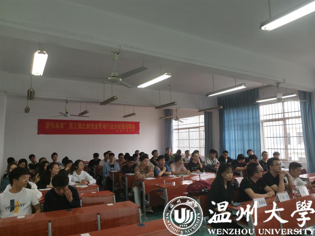 进一步提升我院师生对制造业领域新技术的了解,增强就业竞争力,我院于5月21日下午在机电楼6B403举办生涯“职引未来”第三期之制造业专场行业分析暨招聘会。本次活动邀请到机电学院黄玮副书记,招就处朱秀微老师,机电学院颜孙艇老师,宁德新能源科技有限公司工程师王亮、人力经理裴英姿,长江汽车电子有限公司总工程师吴杰、人力总监助理龚鹏等嘉宾进入课堂,为18级60余位同学上路一堂生动的职规课。