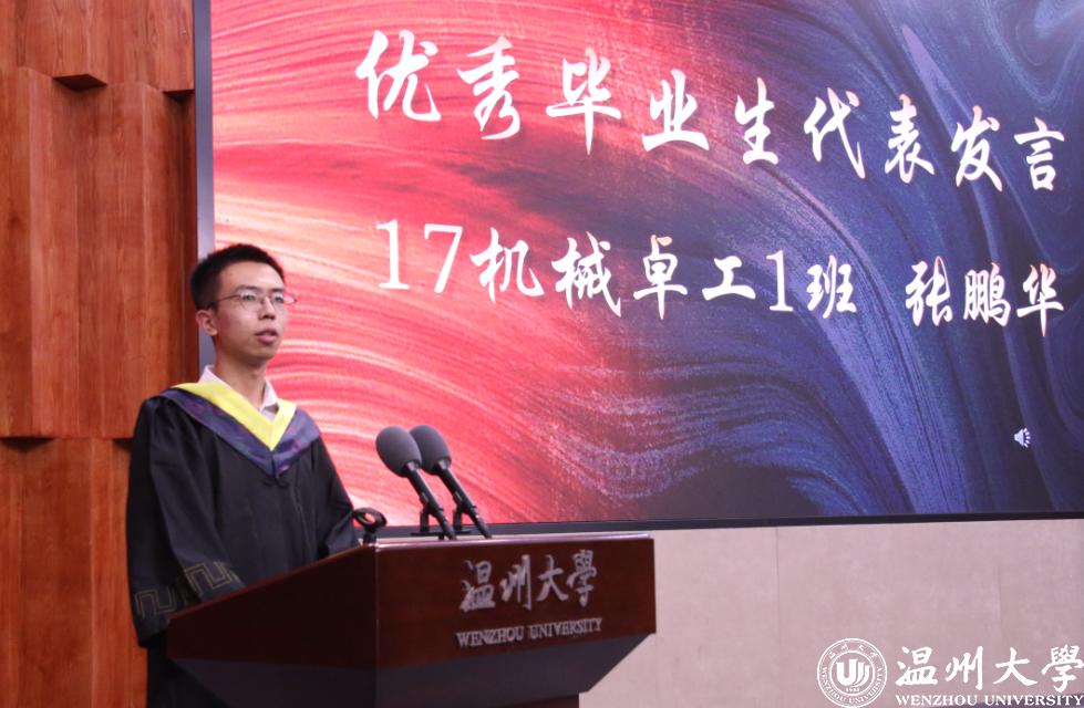 张鹏华同学代表学院全体毕业生发言,他对所有师长们无微不至的关怀与帮助表达了衷心的感谢。“回首往事,感慨万千。四年的时间,1400多个日夜,温大的角角落落都留下了我们成长的足迹。在学习上,上课时虽偶有犯困走神,但这并不影响我们对知识的渴望;晚上考研自习室灯火通明,是大家努力奋斗的证明;运动场上,我们挥洒汗水,拼搏争先,尽显青春率性。”他感恩在温大收获的师生情义和同窗之谊,并说道,四年的老员工活给他带来了巨大的改变,从初入学时对未来的不确定,到如今坚定了自己的理想信念,这是求学路上不断探索、坚持的结果。“逝者如斯夫,不舍昼夜,我们的老员工活将拉上帷幕,但我们的生存之路才刚刚开始。”大学毕业不是终点,而是人生历程的另一个起点,道阻且长,行则将至。