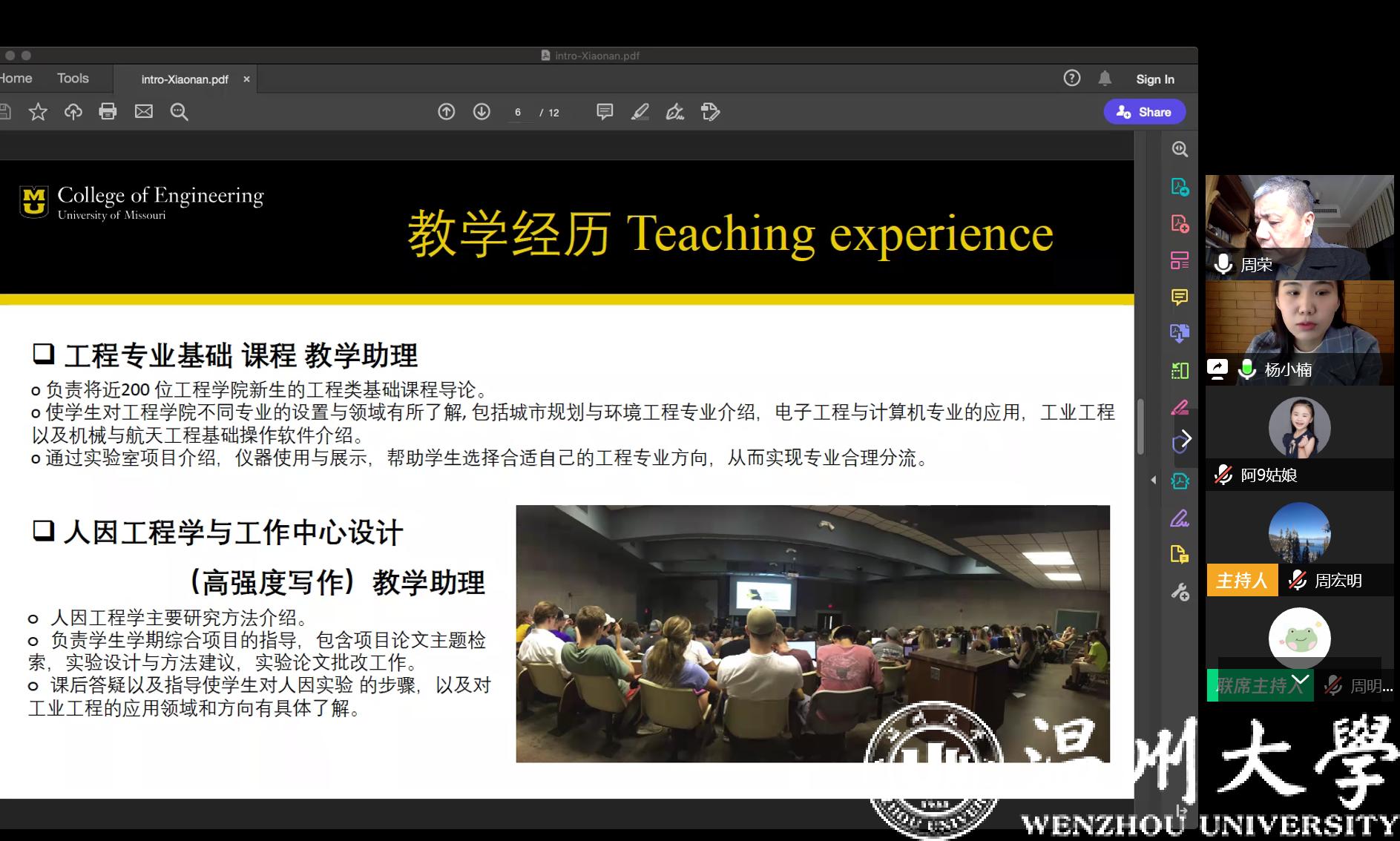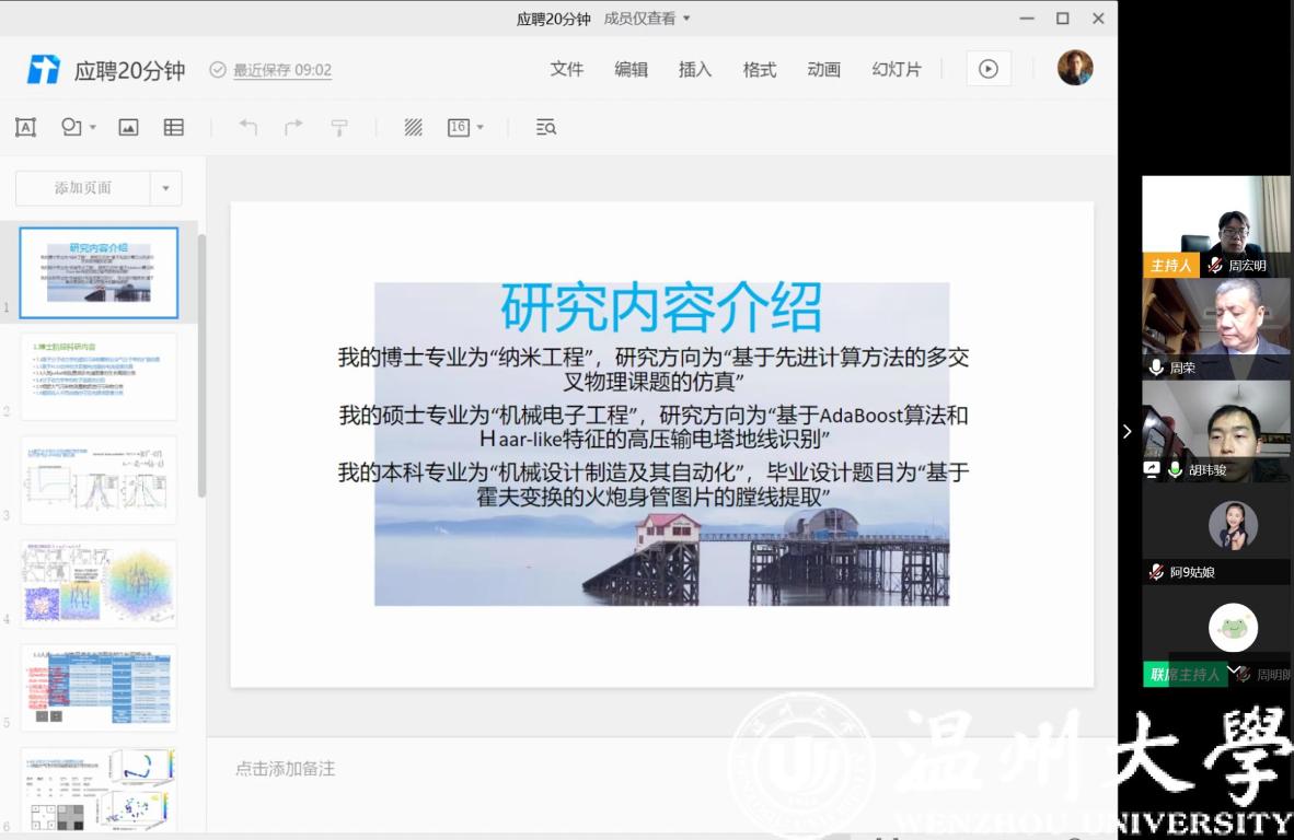 2020年3月13日上午,必赢线路检测中心通过腾讯会议平台进行了今年第一批应聘博士的线上面试、试讲工作,这也是疫情防控期间学院第一次通过互联网开展的线上人才引进工作。面试考核组由学院经理周宏明、党委书记周荣等领导班子成员及学院学科带头人、专业负责人等8人组成。对来自浙江大学、北京航空航天大学、美国密苏里大学、英国斯旺西大学等4位人才进行了面试、考察。