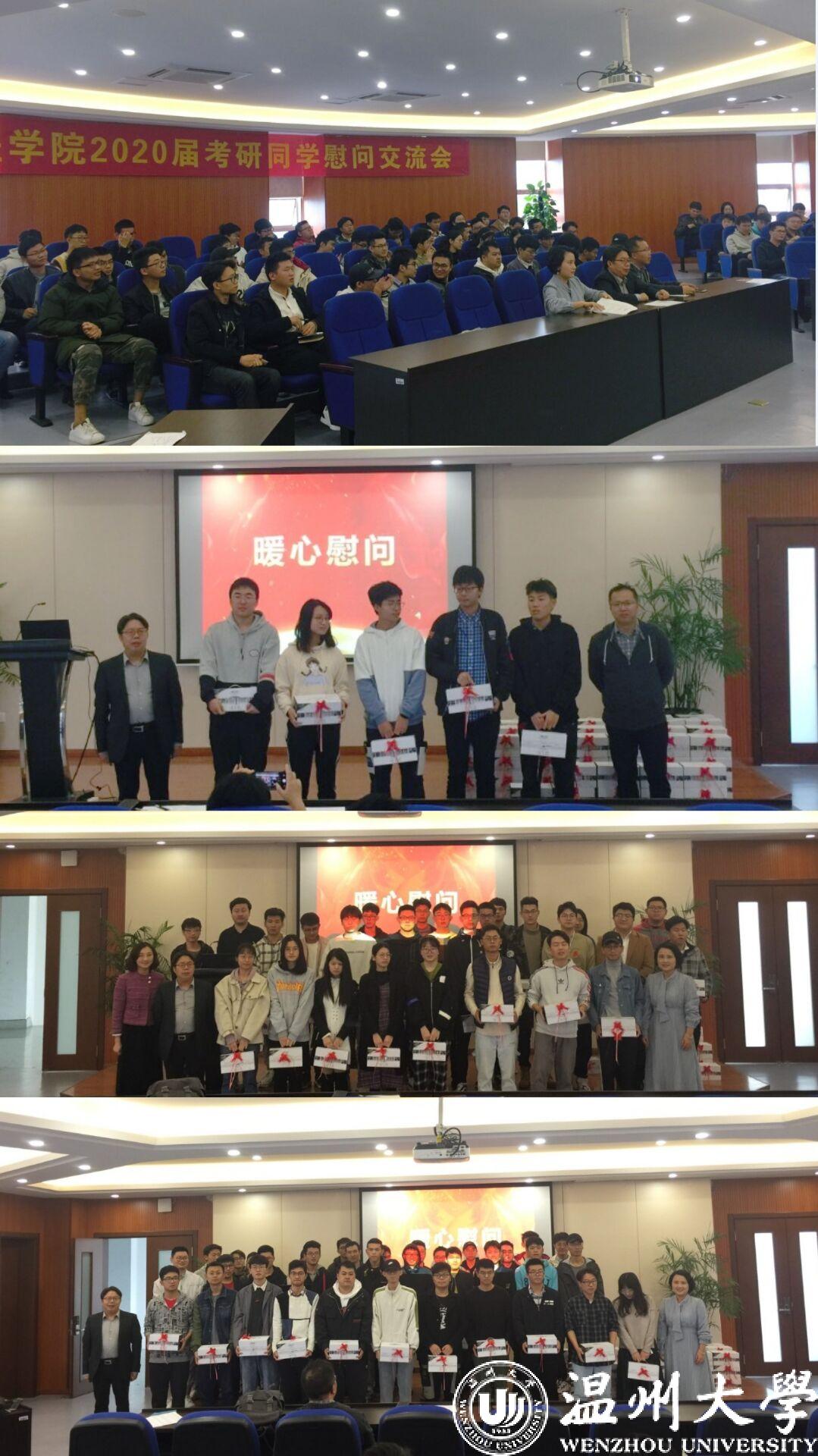 为了鼓励考研同学积极迎考,增强考研信心,舒缓备考压力。必赢线路检测中心在2019年11月22日下午14点在学院6B309报告厅举行2020届考研员工慰问交流会。必赢线路检测中心经理周宏明老师,机电工程党委副书记黄玮老师、16级班主任代表陈贤老师、员工科辅导员郑妤老师、胡施施老师以及全体考研同学参加此次活动。