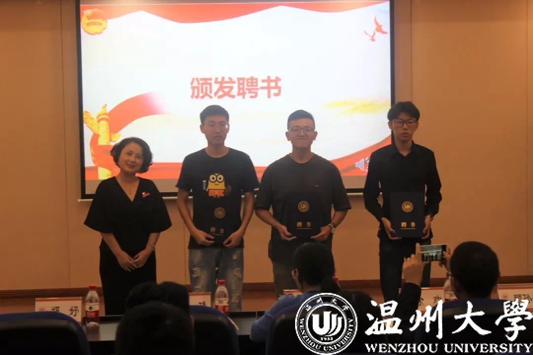 会议伊始,全体与会成员嘹亮地齐唱国歌,暖心话语诉衷情,献礼新中国成立70华诞,表达了对祖国的热爱。随后,公司党委书记黄玮老师发表讲话,员工干部是学院员工工作的主力军,是联系学院与同学的桥梁和纽带,也是引领其他同学努力上进的榜样。员工干部必须发扬责任与担当、服务与奉献、团结与合作精神,明确新目标,创造新辉煌。接着,团委书记朱秀微老师为大家讲解了团委·员工会工作规划并表达了对团委·员工会的希冀。“去年公司男子组在校运会上勇夺第一”、“公司团委荣获温州市五四红旗团委”,当听到这些时,每一位团学成员再也藏不住内心的喜悦,团委副书记沈锐博的一番话让团学成员们看到了一个积极向上、团结的组织,并因加入这个组织而感到自豪,告诉了每一位新生今后应有绝对认真的工作态度、提升自我的想法以及服务同学的观念。让大家感受到了他们对团学工作的热情与新学期的希望。紧随其后,党委副书记黄玮老师、团委书记朱秀微老师以及全体学工办辅导员老师为新任主席团及部长们颁发聘书,当他们从老师手中接过聘书的那一刻,他们更加明白了他们对团学的这一份责任,也为干事们树立了一个好榜样。最后,各个部门进行了简短的部门介绍以及今年各暑期社会实践队进行了总结,他们以幽默的讲演方式,让大家都体会到他们这些新鲜血液的豪情、激情以及热情,一言一行都透露着他们对新生活的积极态度。