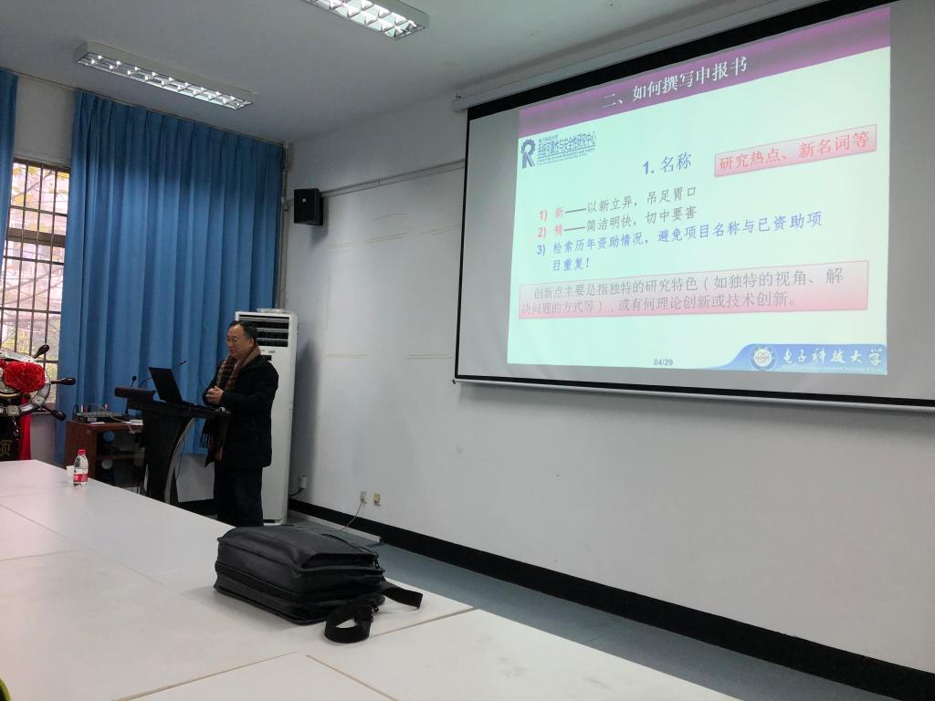 黄洪钟教授首先从申报要点进行分析,他指出评议评价标准;然后着重讲解了如何撰写国家自然基金申请书,从名称、摘要、立项依据、研究内容与目标、关键科学问题、研究方案、可性能分析、创新点、研究基础等几方面内容介绍了申请书的写作技巧,并提出关于申请书的几点建议及注意事项。接着他结合了自身的科研经历,鼓励现场的青年教师做科研时要多思考、多总结,大胆地去做。在提问环节,他和学院老师交流了有关基金申请书写作要点等方面的经验。