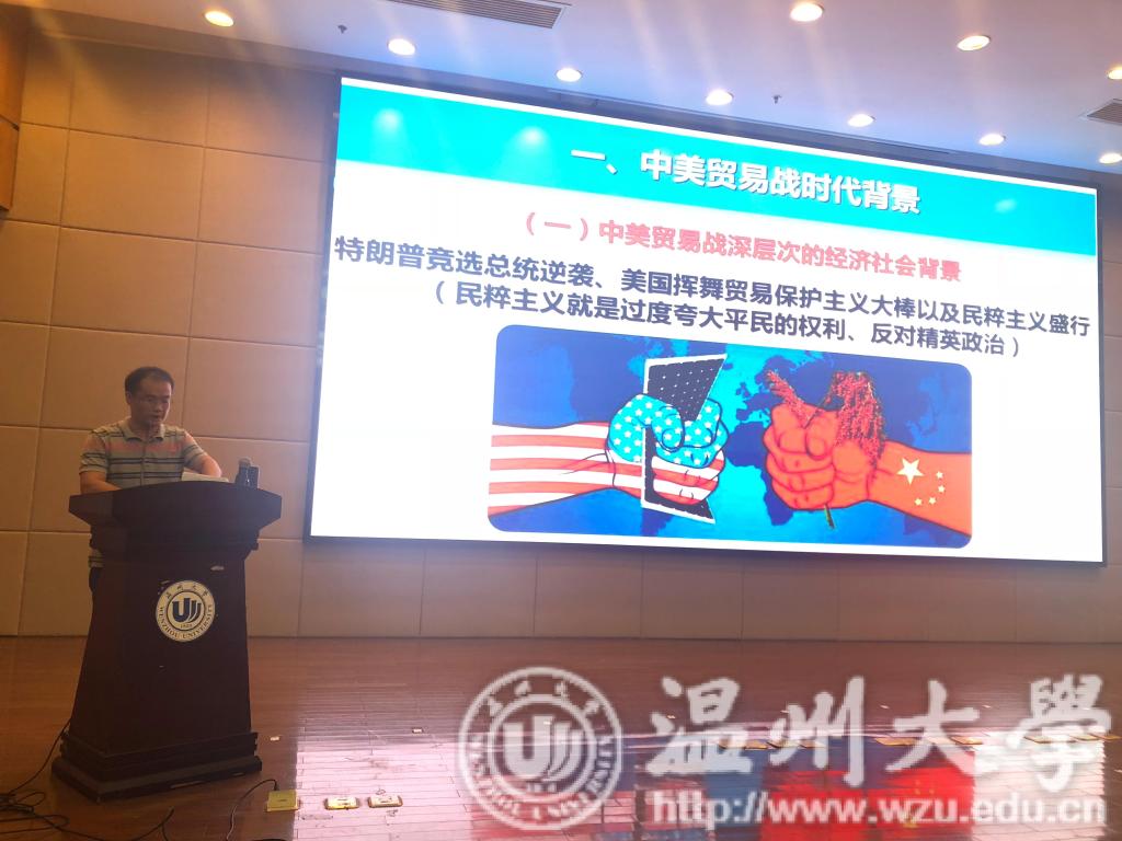 蓝立志老师以“正确认识妥善应对中美贸易摩擦”为题,从中美贸易战时代背景、中美贸易战原因分析、中美贸易战前世今生、坚决反对美国贸易欺凌等四个方面,聚焦中美贸易摩擦的核心内容,精辟分析了特朗普上台后实施的一系列政策和举动,从中美两国经济状况着手,辅之以中美贸易战的历史,突出美国国际政治和地缘战略的不正当性和逆全球性。蓝老师从我国坚决反击美国贸易欺凌的信心出发,着重强调了以习近平同志为核心的党中央的坚强领导、改革开放带来的全世界最大的市场规模、比较完善的工业体系和国民经济体系、中国特色社会主义制度、强大的国际影响力、道义制高点和民族凝聚力等是我国迎战的底气。最后,蓝老师呼吁同学们以实际行动支持中国经济,共同抵制美国的贸易手段。