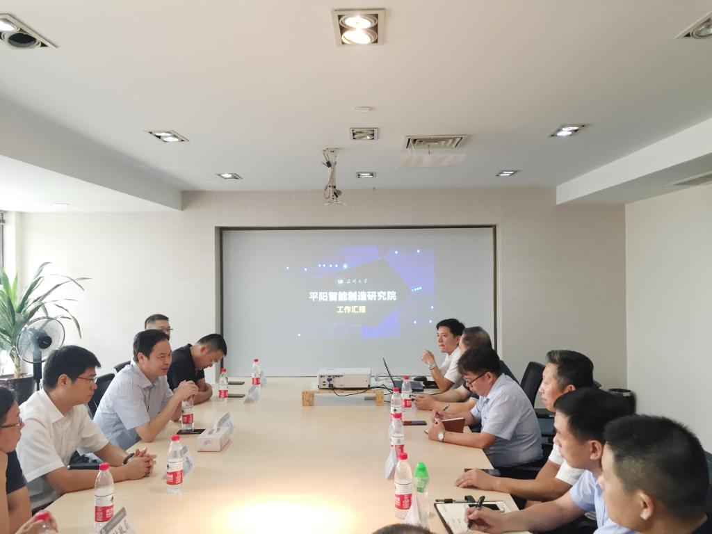 在随后的汇报会上,研究院向与会领导详细介绍了平阳智能制造研究院成立以来的成果,包括展厅建设、团队建设、校企合作工作进展等,还重点介绍了研究院激光团队、车辆技术团队在欧利特转型升级激光产业、三星机电研发智能车辆关键零部件方面的关键作用。