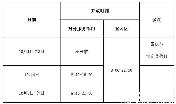 根据学校国庆节放假调休的通知,图书馆国庆节期间开放安排如下:
