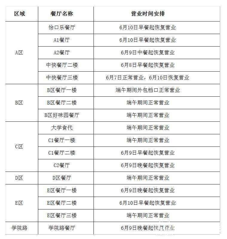 根据学校2019年端午放假的通知,2019年6月7日至2019年6月9日为2019年端午假期,现将各餐厅营业时间安排通知如下: