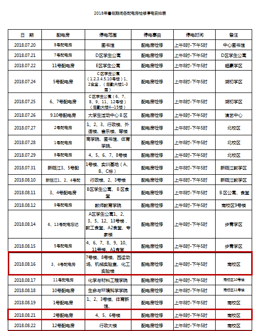 为确保学校电力设施完好,根据国家电网有关规定,学校决定在暑假期间对茶山南北校区、各生活区配电房进行断电检修,具体停电计划详见附表。如有不便,敬请谅解!